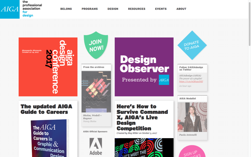 Another component that can make or break conversion rates is your copy. First and foremost, your copy should make sense. Depending on your industry, however, there is wiggle room for creativity. The American Institute of Graphic Art (otherwise known as AIGA) is an association for designers. Their homepage features a creative grid layout with fun colors, artistic graphics, and keywords that emulate community and creativity. If you dive into other pages, you can see this kind of copy carried throughout the site.