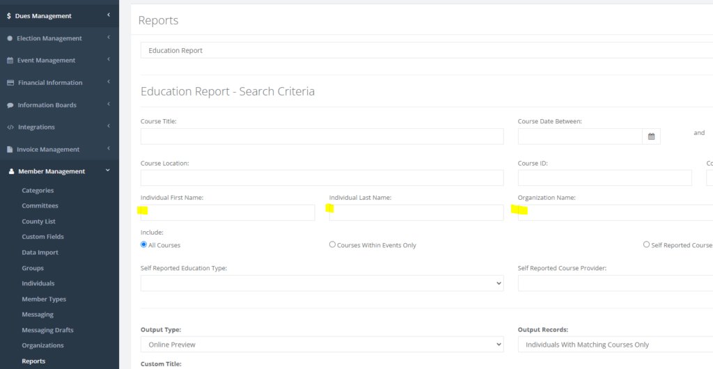 The Education Report in the Member Management > Reports area now has additional filters for First Name, Last Name, and Organization Name.