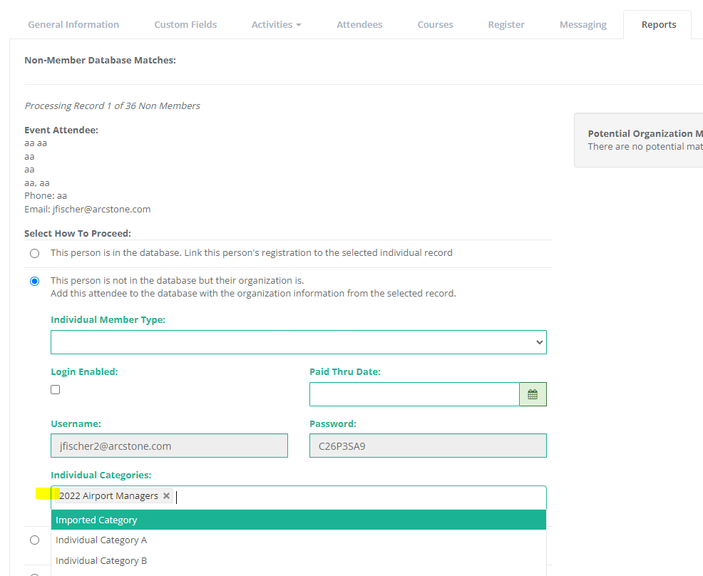 We have now added the ability to add Individual Categories when running the Non-Member Database Matches Tool in the Events > Reports area