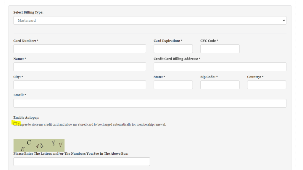 Once you enabled this feature this will allow Members during the New Membership Application & Membership Renewal process to opt into Auto Dues Renewals and save their card at the same time when making a payment.