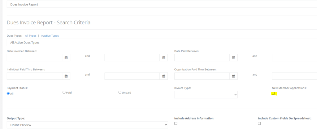 Dues Invoice Report – New Member Application Filter