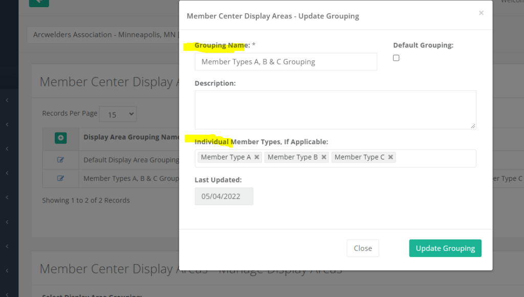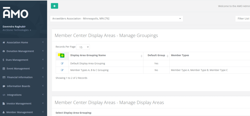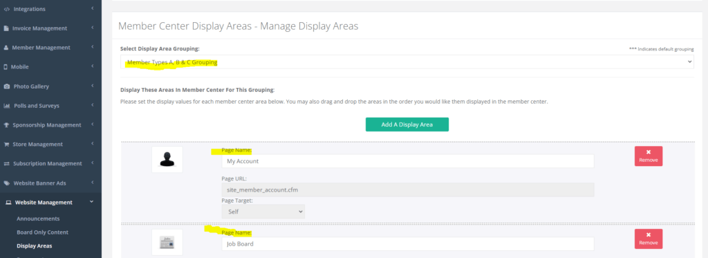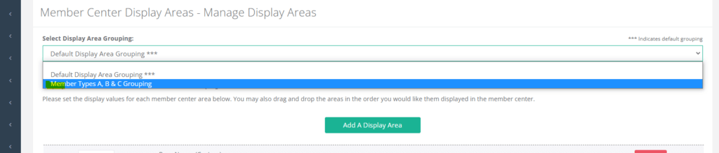 We’re very excited to share one of our largest updates to AMO recently – we’ve now added an entire system to show different Member Center views depending on their Member Type! Some of you may have noticed under the Website Management > Display Areas there is now a grouping system at the top of the screen.