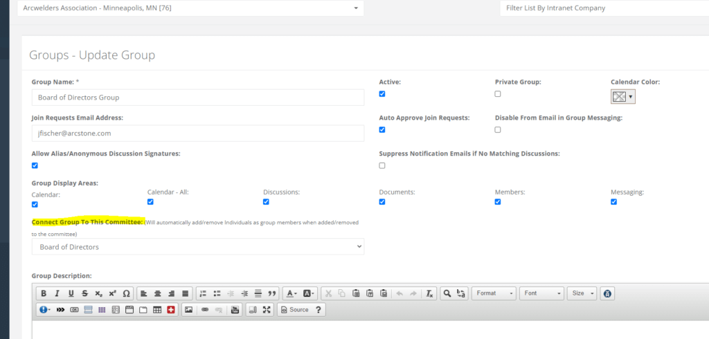 If you go to edit a group you’ll see a new drop-down here to connect this group to a Committee –