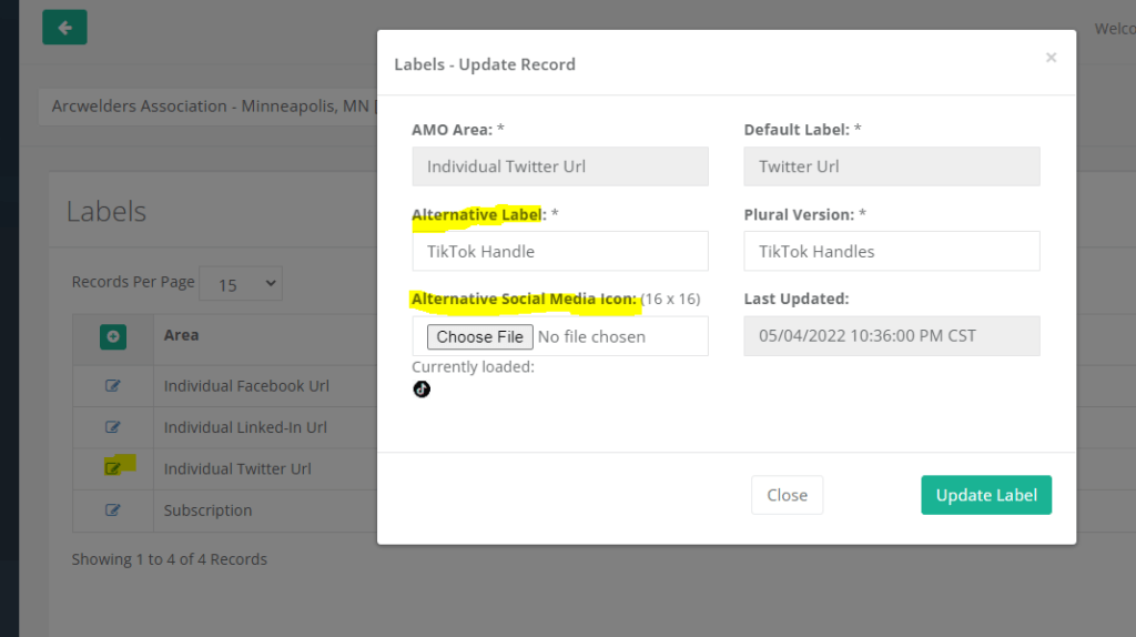 If you head to Association Home > Labels, you’ll now see you can relabel the Facebook, LinkedIn and Twitter to another social media (TikTok for example) and even add the different icon there as well.