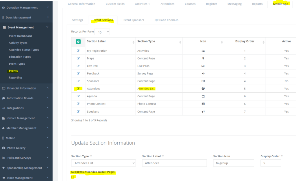 PWA / Mobile App – Event Sections – Attendee List – Suppress Attendee Detail Page