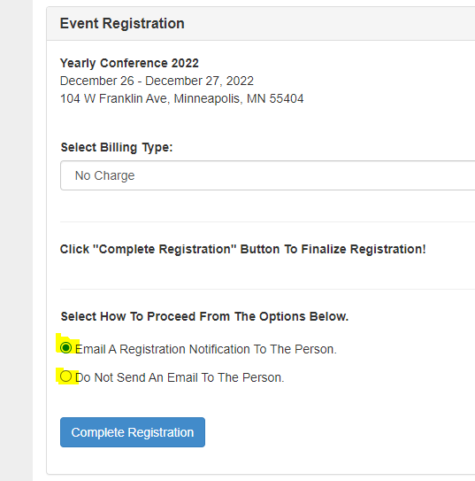 For Complimentary via Admin Registration there is now functionality to control the e-mail response for these types of Admin registrations