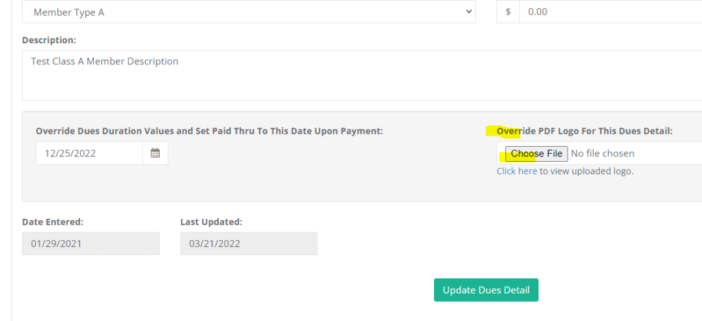 You can now change the PDF Logo per Dues Type on the Dues Detail screen.