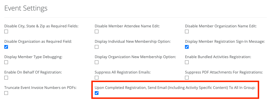 First, enable “Upon Completed Registration, Send Email (Including Activity Specific Content) To All In Group:” feature under the General Tab -> Event Settings: