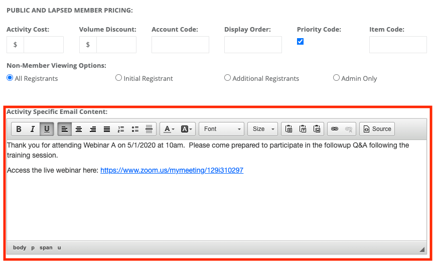 Example: You have a weekend-long event created and within that event there are three webinar options taking place over the course of the weekend. You’ve set the various webinars as activity options; they each have a price and a unique webinar URL associated with them.
