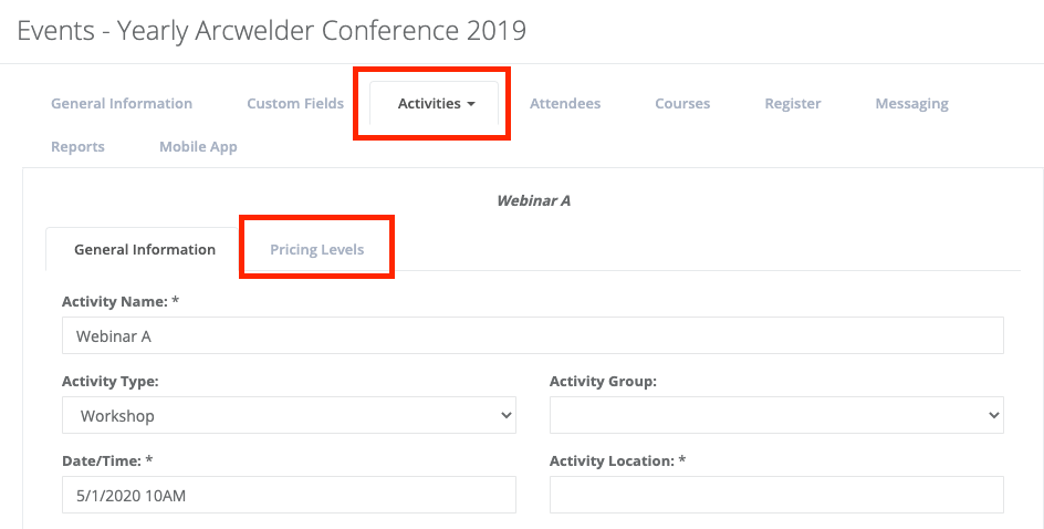 The first thing you’ll notice when you edit an existing activity is that the pricing options for Member and Non-Member are no longer visible; these have been moved to a new tab called Pricing Levels: