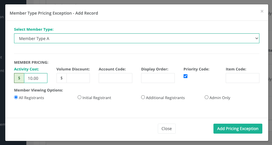 Click the green plus icon to add a pricing exception. In the dropdown at the top, select the member type you’d like to setup. All of the fields are the same as the Member/Non-member fields that you’re used to seeing: